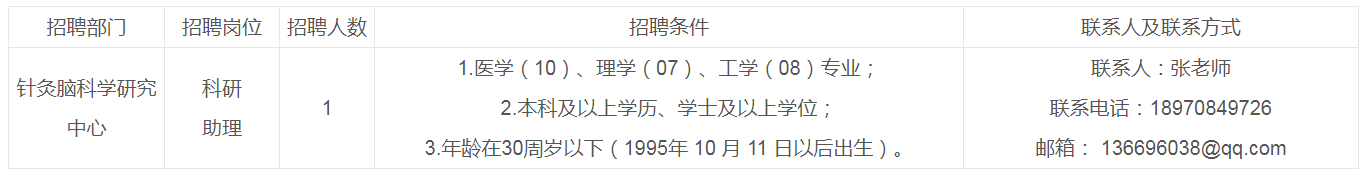 因工作需要,江西中医药大学针灸脑科学研究中心现招聘科研助理一名,现将有关事项公告如下: